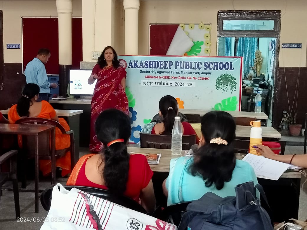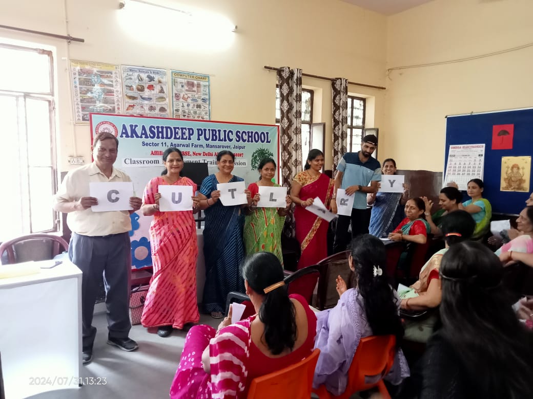 On July 31, Akashdeep Public School hosted a teacher training session focused on classroom management, led by resource person Khushboo Bhatnagar. The session covered essential strategies for fostering a positive learning environment, including setting clear expectations, engaging students effectively, and managing classroom behaviors proactively. Teachers were guided on creating routines, maintaining student engagement, and using positive reinforcement to promote a conducive atmosphere for learning. The session also emphasized the importance of cultural competence and self-care for educators.
